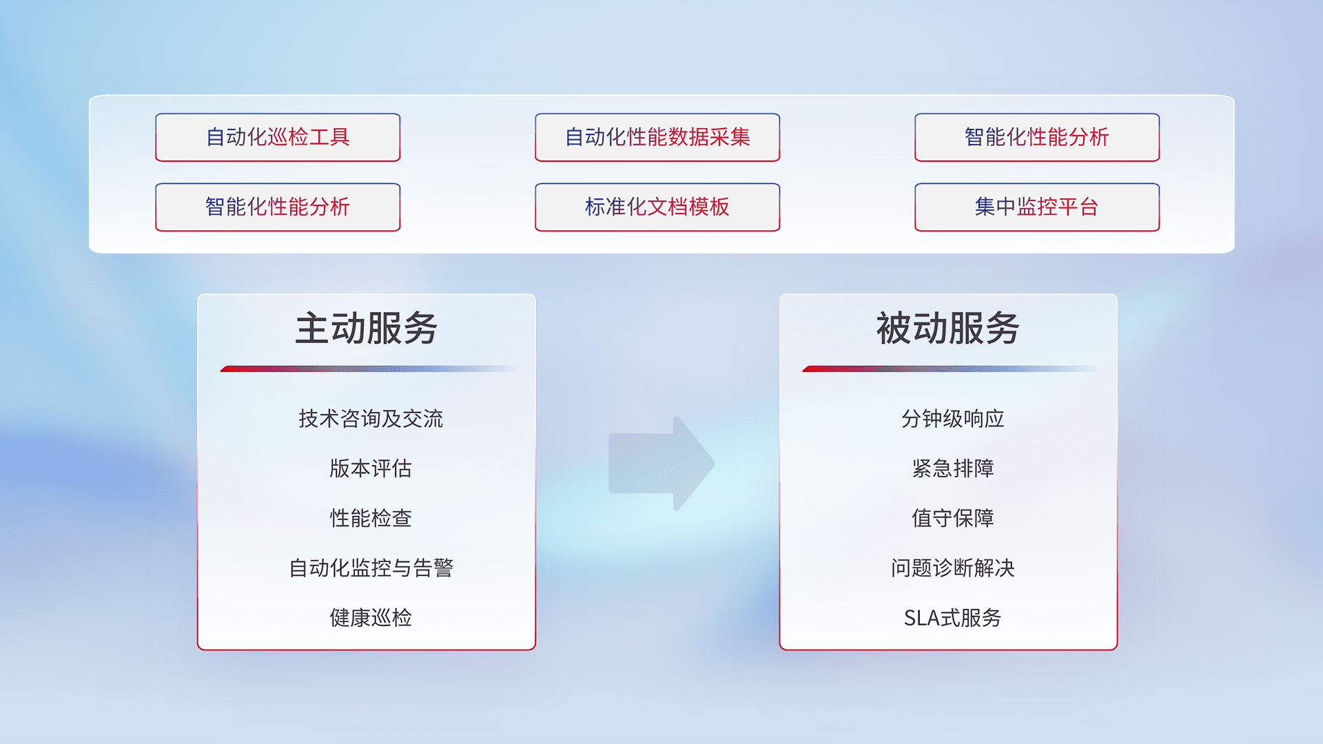 智能化工具和标准化文档,,保障服务质量,,,,提供主动服务(包含技术咨询、、、、版本评估、、性能检查、、自动化监控与告警、、、、健康巡检)和被动服务包含(分钟级响应、、紧急排障、、值守保障、、、、问题诊断解决、、、SLA服务)。。