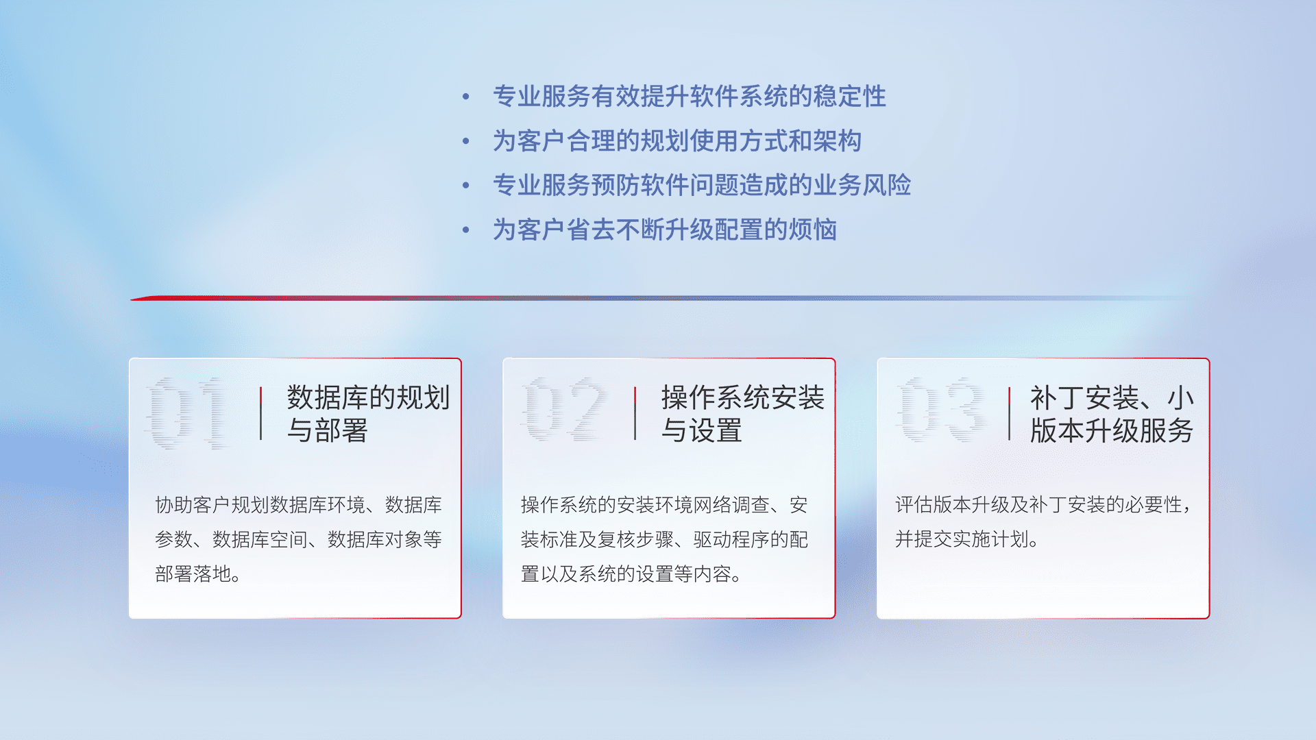 为客户提供软件规模升级、、快速部署、、按需配置的专业服务,,从数据库的规划与部署到操作系统的安装与设置,,,,再到补丁安装和小版本升级提供支持。。。